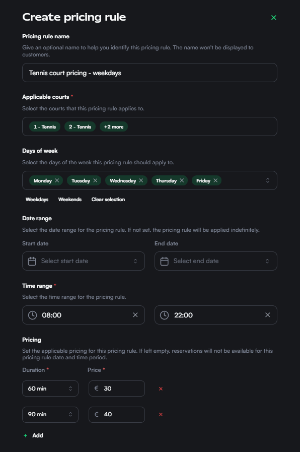 💡TIP: Create a pricing rule for every sport/court individually so in the future they are easier to manage.